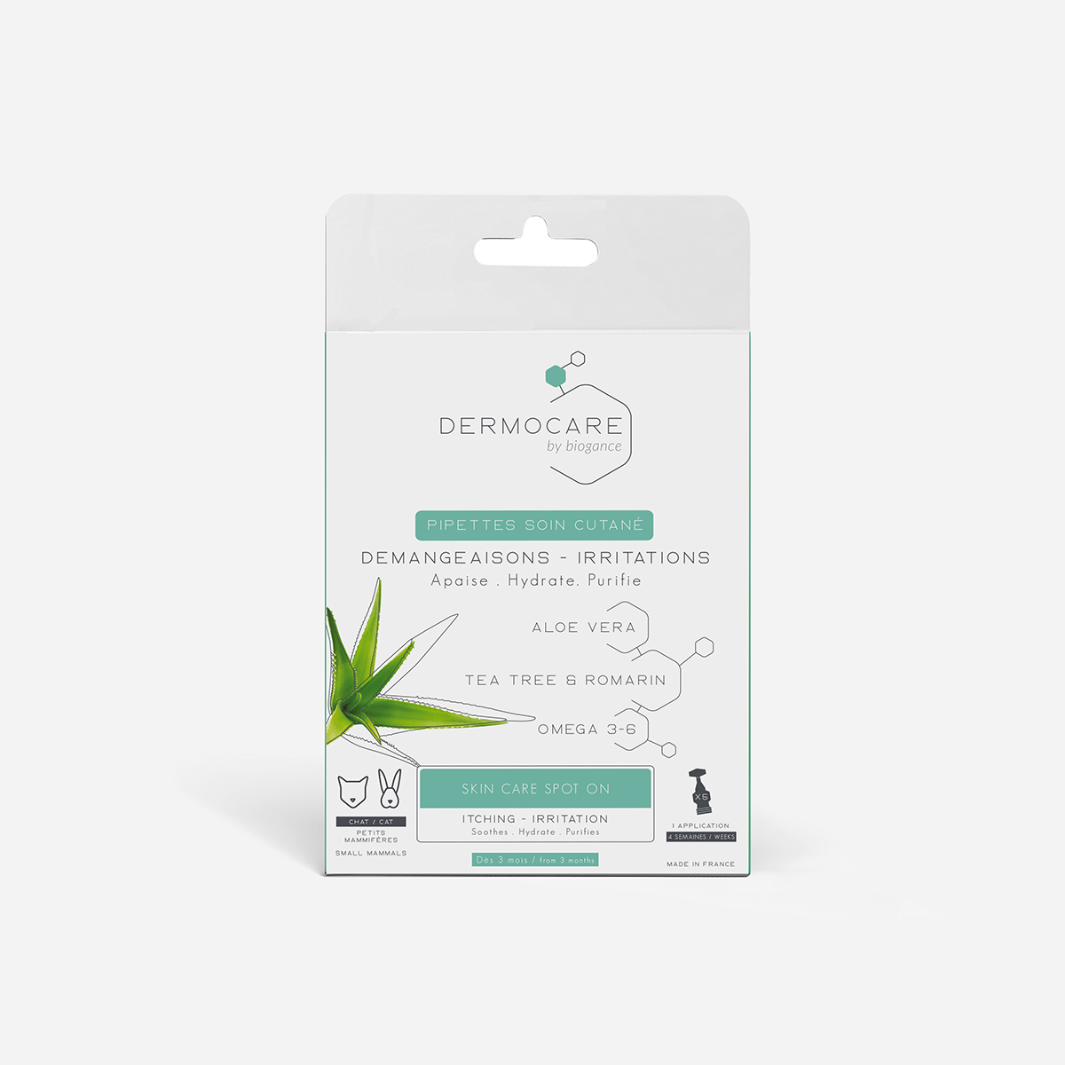 Les pipettes Dermocare+ spéciales soin cutané pour chat sont formulées à base d’aloé vera, d’huiles de tamanu et d’onagre bio ainsi qu’un complexe d’huiles essentielles. Elles apaisent, hydratent, purifient, soulagent les démangeaisons, favorisent la régénération de la peau et la croissance du pelage.